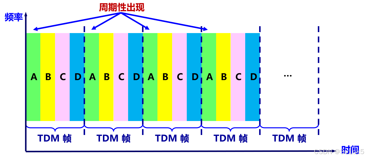 - 每一个用户所占用的时隙是周期性地出现(其周期就是TDM帧的长度)的。