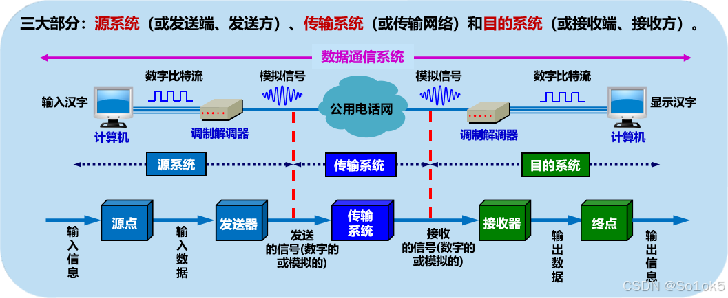 - 信号流程:输入数据 → 发送器生成数字/模拟信号 → 传输系统 → 接收器解析信号 → 输出数据。