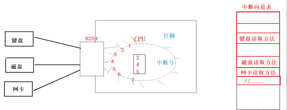 之后 CPU 会以这个中断号为下标,接着CPU去操作系统中的中断向量表(下面讲)中执行对应的方法(或者称为所对应的程序),即通过中断号找到并执行中断处理程序,该程序负责从产生中断的硬件中读取数据,并存入内存。”
