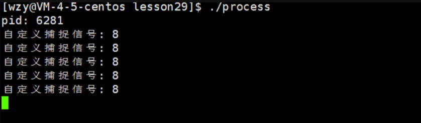 {std::cout << "pid: " << getpid() << std::endl;signal(8, handler);int x = 10;x /= 0;while(true){}return 0;