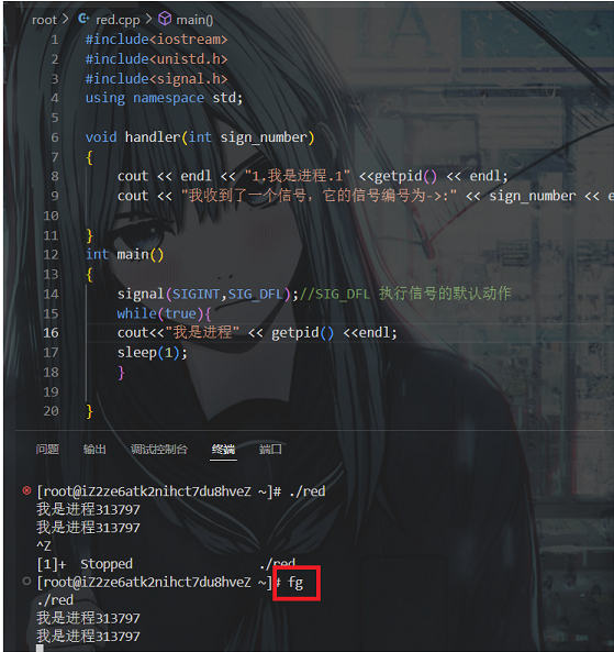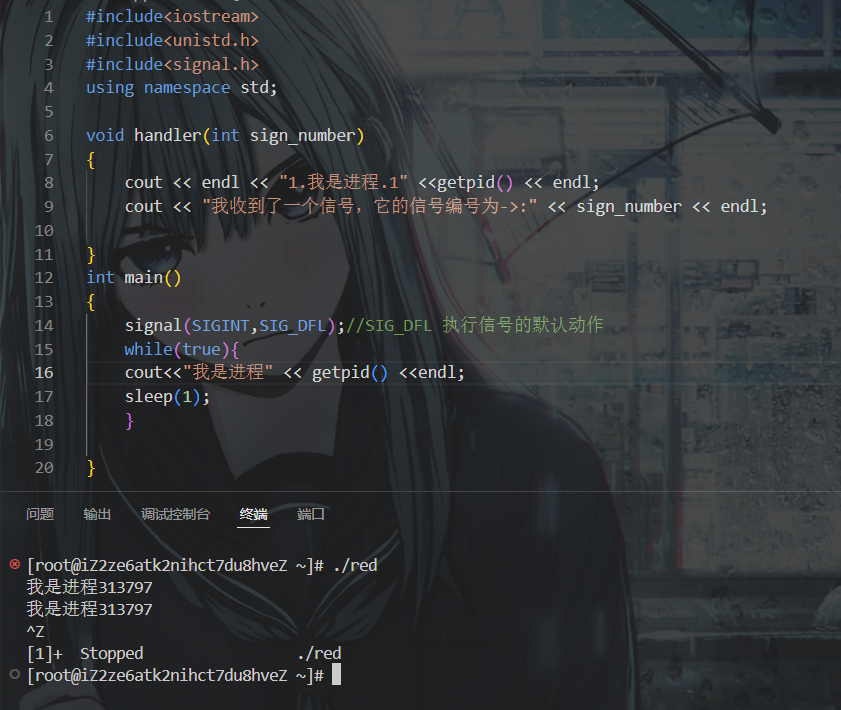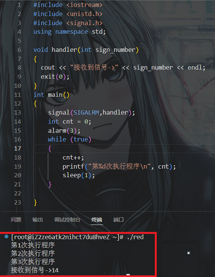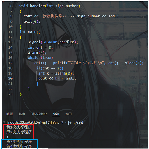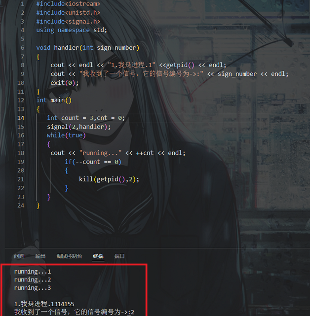 {int count = 3, cnt = 0;signal(2, handler);//自定义捕捉2号信号while(true){std::cout << "running ..." << ++cnt << std::endl;if(--count == 0)kill(getpid(), 2);sleep(1);}return 0;