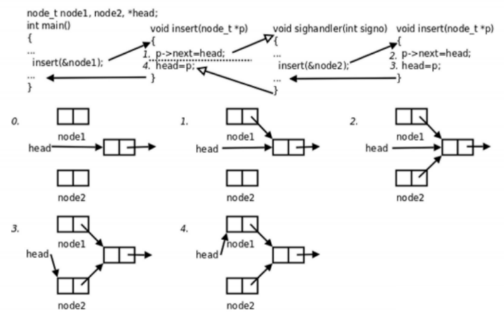 insert函数 访问一个全局链表,有可能因为重入而造成错乱,像这样的函数称为 不可重入函数,反之,如果一个函数只访问自己的局部变量或参数,则称为可重入(Reentrant) 函数!