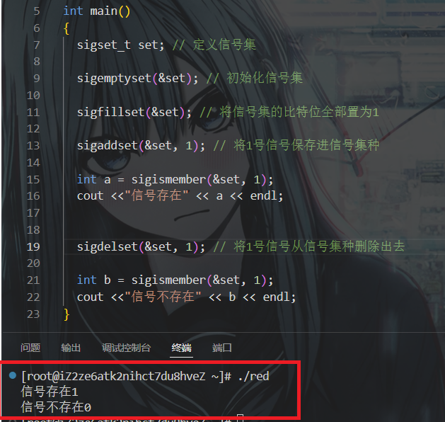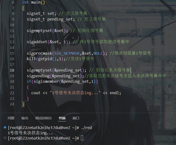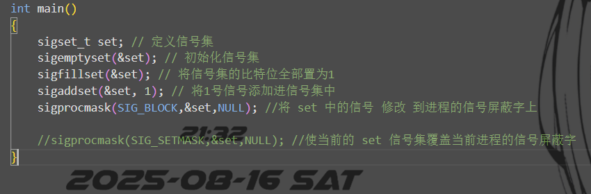 {sigset_t set; // 定义信号集sigset_t pending_set; // 定义未决信号集sigemptyset(&set); // 初始化信号集sigaddset(&set, 1); // 将1号信号添加进信号集中sigprocmask(SIG_SETMASK,&set,NULL); //使进程阻塞1号信号kill(getpid(),1);//发送1号信号sigemptyset(&pending_set); // 初始化未决信号集sigpending(&pending_set);//读取当前未决信号并放入自己定义的未决信号集中if(sigismember(&pending_set,1)){cout << "1号信号未决状态ing..." << endl;}