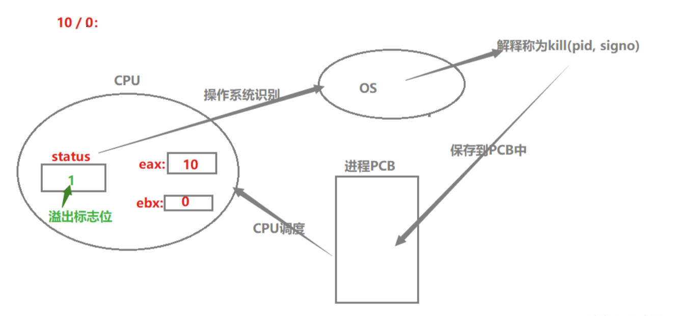 对于刚才的代码,我们执行的是x/0, 假设x是10,此时CPU中的寄存器eax保存的就是10,寄存器ebx保存的就是0,10/0本质上是除以一个无限小的数,那么结果就是无限的大,导致发生结果溢出,那么结果溢出了,status寄存器中的标志位就会由0变为1,同时停止当前进程,并通知操作系统。