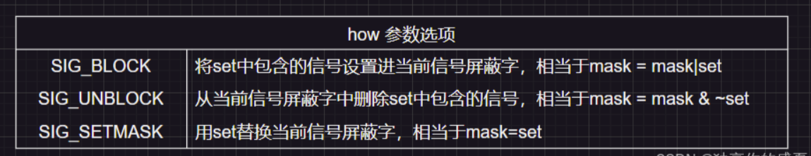int sigprocmask(int how, const sigset_t *set, sigset_t *oset);