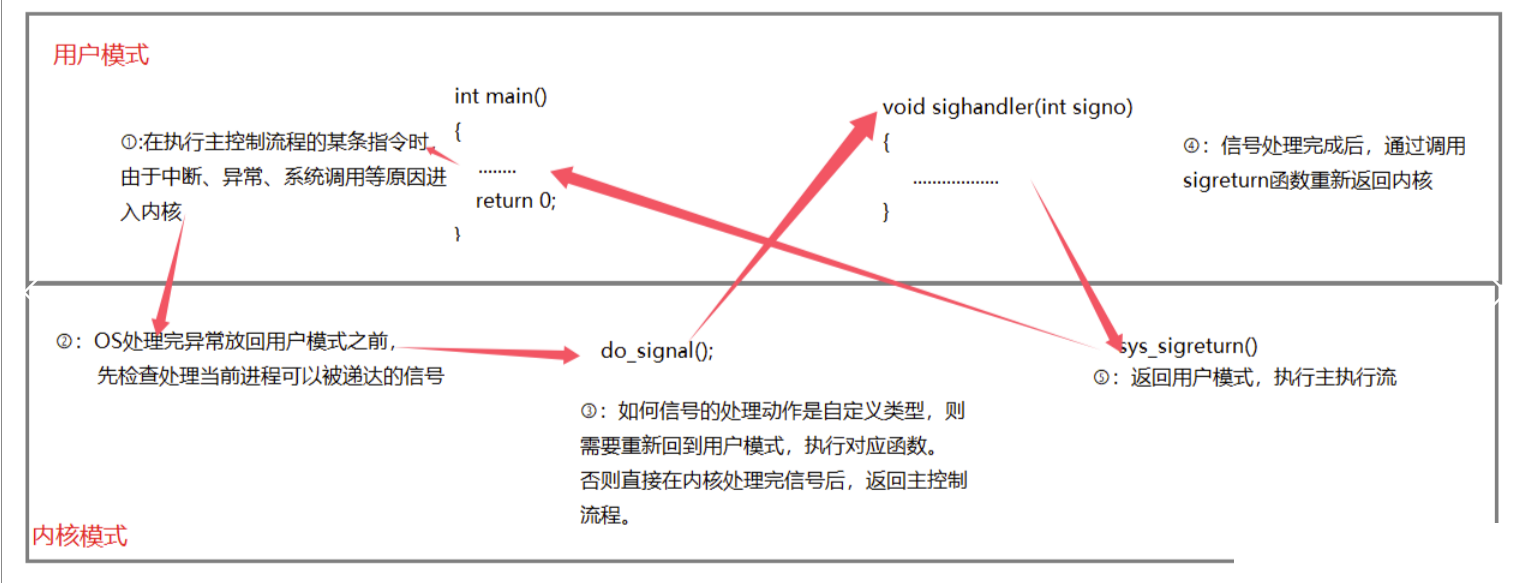一个进程是有时间片的,那么有时间片就会涉及到进程切换。当进程重新被加载运行时,OS需要先进行内核态将当前进程的数据进行恢复。恢复完成之后,OS需要将进程的工作模式从内核态切换回用户态。在该过程中,OS会对进程信号进行自定义捕捉,对信号进行处理!(因为我们上面提到过,最后一步从内核态回到用户态是要检测是否还有信号未处理的,但是对进程信号自定义捕捉并不意味着一定会发生信号捕捉。如果没有信号要处理那就不会发生信号捕捉,而是直接返回用户态)