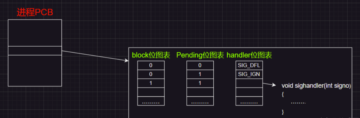 接下来操作系统知道status寄存器的标志位变为1了,OS识别到这是一个错误,于是把这个异常解释为kill(targetprocess, signo),然后将kill生成的信号保存到PCB中。