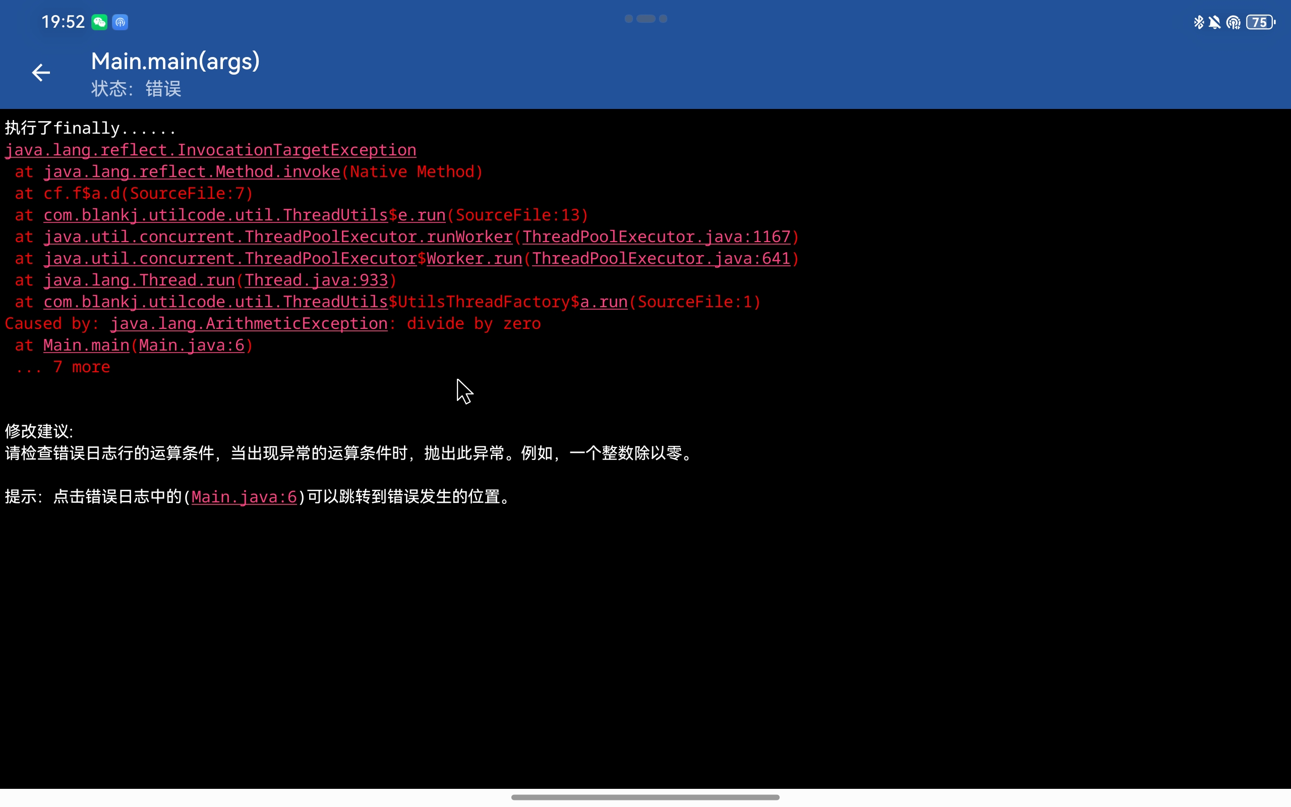 public class Main {public static void main(String[] args) {try {int n1 = 10;int n2 = 0;System.out.println(n1 / n2);} finally {System.out.println("执行了finally......");}System.out.println("程序继续执行........");}