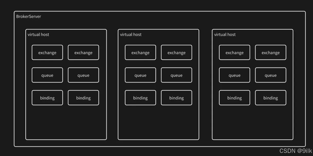 VirtualHost): 类似于 MySQL 的 "database", 是一个逻辑上的集合。一个 BrokerServer 上可以存在多个 VirtualHost -