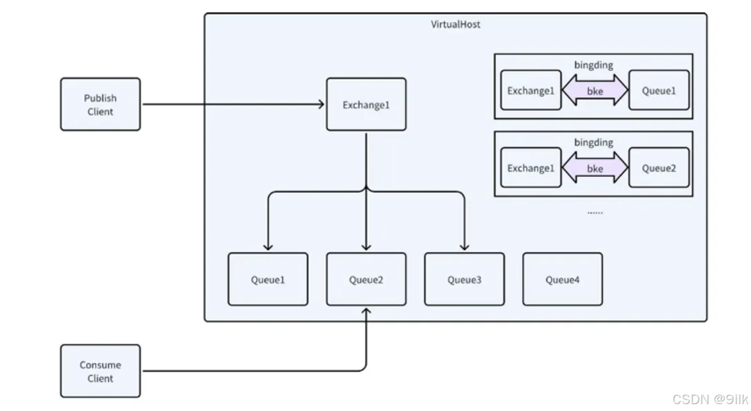 Binding) :Exchange和Queue之间的关联关系,Exchange和Queue可以 理解成 "多对多" 关系,使用一个关联表就可以把这两个概念联系起来。 -