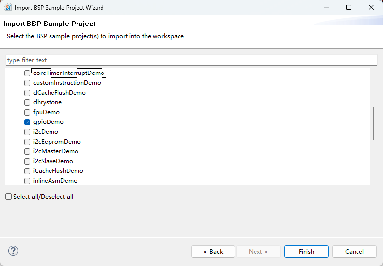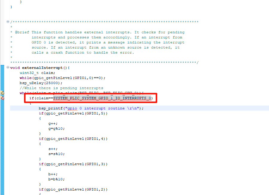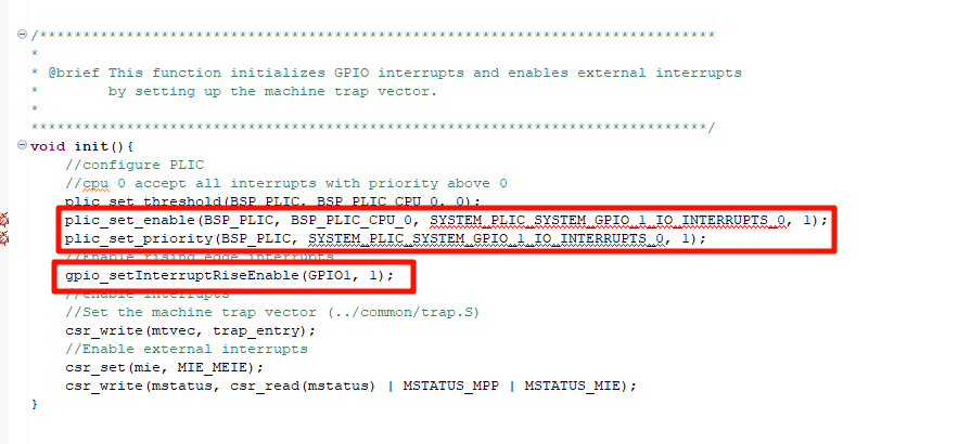 在gpioDemo的 init() 函数中有对中断的初始化和使能,当自己要修改成指定的引脚的时候,要修改我红框框住的函数的参数即可。