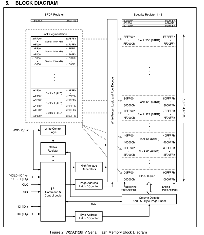 几乎所有知名厂商(华邦、兆易创新、旺宏、美光等)的 SPI NOR 都遵循这一结构,仅在具体大小上因容量不同略有差异: