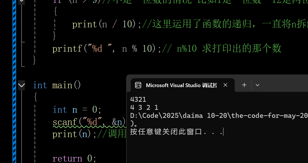 {if (n > 9)//不是一位数的情况 比如1是一位数 12是两位数{print(n / 10);//这里运用了函数的递归,一直将n拆解为最简单的值 n/10是求打印出的那个数}printf("%d ", n % 10);// n%10 求打印出的那个数