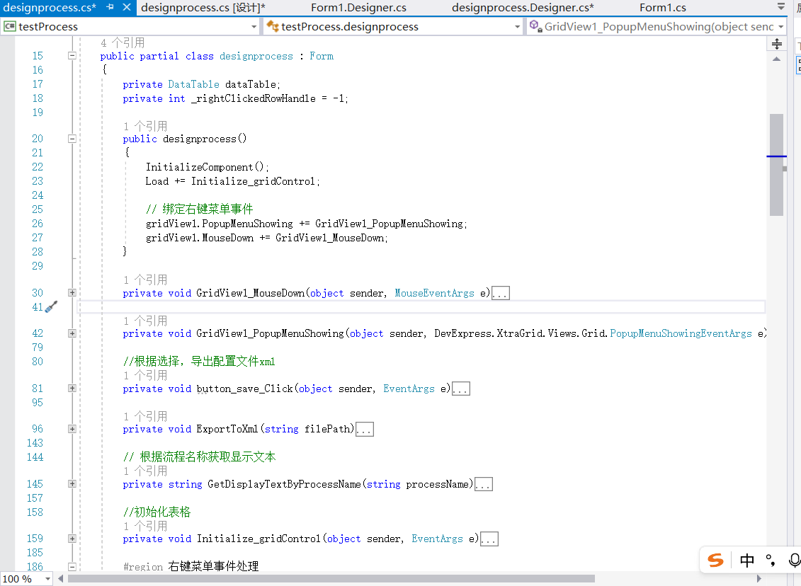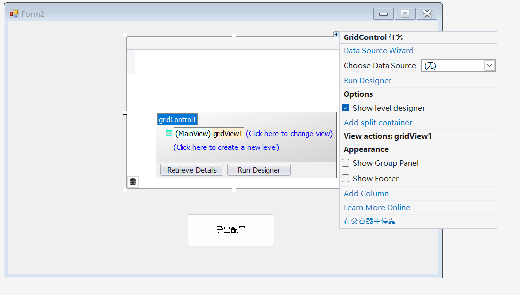 {partial class designprocess{/// <summary>/// Required designer variable./// </summary>private System.ComponentModel.IContainer components = null;/// <summary>/// Clean up any resources being used./// </summary>/// <param name="disposing">true if managed resources should be disposed; otherwise, false.</param>protected override void Dispose(bool disposing){if (disposing && (components != null)){components.Dispose();}base.Dispose(disposing);}#region Windows Form Designer generated code/// <summary>/// Required method for Designer support - do not modify/// the contents of this method with the code editor./// </summary>private void InitializeComponent(){this.gridControl1 = new DevExpress.XtraGrid.GridControl();this.gridView1 = new DevExpress.XtraGrid.Views.Grid.GridView();this.button_save = new System.Windows.Forms.Button();((System.ComponentModel.ISupportInitialize)(this.gridControl1)).BeginInit();((System.ComponentModel.ISupportInitialize)(this.gridView1)).BeginInit();this.SuspendLayout();// // gridControl1// this.gridControl1.Location = new System.Drawing.Point(238, 30);this.gridControl1.MainView = this.gridView1;this.gridControl1.Name = "gridControl1";this.gridControl1.Size = new System.Drawing.Size(436, 310);this.gridControl1.TabIndex = 0;this.gridControl1.ViewCollection.AddRange(new DevExpress.XtraGrid.Views.Base.BaseView[] {this.gridView1});// // gridView1// this.gridView1.GridControl = this.gridControl1;this.gridView1.Name = "gridView1";this.gridView1.OptionsView.ShowGroupPanel = false;// // button_save// this.button_save.Location = new System.Drawing.Point(362, 390);this.button_save.Name = "button_save";this.button_save.Size = new System.Drawing.Size(177, 67);this.button_save.TabIndex = 1;this.button_save.Text = "导出配置";this.button_save.UseVisualStyleBackColor = true;this.button_save.Click += new System.EventHandler(this.button_save_Click);// // designprocess// this.AutoScaleDimensions = new System.Drawing.SizeF(8F, 15F);this.AutoScaleMode = System.Windows.Forms.AutoScaleMode.Font;this.ClientSize = new System.Drawing.Size(870, 512);this.Controls.Add(this.button_save);this.Controls.Add(this.gridControl1);this.Name = "designprocess";this.Text = "Form2";((System.ComponentModel.ISupportInitialize)(this.gridControl1)).EndInit();((System.ComponentModel.ISupportInitialize)(this.gridView1)).EndInit();this.ResumeLayout(false);}#endregionprivate DevExpress.XtraGrid.GridControl gridControl1;private DevExpress.XtraGrid.Views.Grid.GridView gridView1;private System.Windows.Forms.Button button_save;}