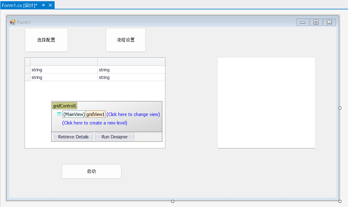 {partial class Form1{/// <summary>/// 必需的设计器变量。/// </summary>private System.ComponentModel.IContainer components = null;/// <summary>/// 清理所有正在使用的资源。/// </summary>/// <param name="disposing">如果应释放托管资源,为 true;否则为 false。</param>protected override void Dispose(bool disposing){if (disposing && (components != null)){components.Dispose();}base.Dispose(disposing);}#region Windows 窗体设计器生成的代码/// <summary>/// 设计器支持所需的方法 - 不要修改/// 使用代码编辑器修改此方法的内容。/// </summary>private void InitializeComponent(){this.components = new System.ComponentModel.Container();this.button_choose = new System.Windows.Forms.Button();this.gridControl1 = new DevExpress.XtraGrid.GridControl();this.gridView1 = new DevExpress.XtraGrid.Views.Grid.GridView();this.behaviorManager1 = new DevExpress.Utils.Behaviors.BehaviorManager(this.components);this.button_Design = new System.Windows.Forms.Button();this.button_start = new System.Windows.Forms.Button();this.textBox1 = new System.Windows.Forms.TextBox();((System.ComponentModel.ISupportInitialize)(this.gridControl1)).BeginInit();((System.ComponentModel.ISupportInitialize)(this.gridView1)).BeginInit();((System.ComponentModel.ISupportInitialize)(this.behaviorManager1)).BeginInit();this.SuspendLayout();// // button_choose// this.button_choose.Location = new System.Drawing.Point(51, 3);this.button_choose.Name = "button_choose";this.button_choose.Size = new System.Drawing.Size(144, 81);this.button_choose.TabIndex = 0;this.button_choose.Text = "选择配置";this.button_choose.UseVisualStyleBackColor = true;this.button_choose.Click += new System.EventHandler(this.button_choose_Click);// // gridControl1// this.gridControl1.Location = new System.Drawing.Point(51, 101);this.gridControl1.MainView = this.gridView1;this.gridControl1.Name = "gridControl1";this.gridControl1.Size = new System.Drawing.Size(464, 300);this.gridControl1.TabIndex = 1;this.gridControl1.ViewCollection.AddRange(new DevExpress.XtraGrid.Views.Base.BaseView[] {this.gridView1});// // gridView1// this.gridView1.GridControl = this.gridControl1;this.gridView1.Name = "gridView1";this.gridView1.OptionsView.ShowGroupPanel = false;// // button_Design// this.button_Design.Location = new System.Drawing.Point(318, 3);this.button_Design.Name = "button_Design";this.button_Design.Size = new System.Drawing.Size(133, 81);this.button_Design.TabIndex = 2;this.button_Design.Text = "流程设置";this.button_Design.UseVisualStyleBackColor = true;this.button_Design.Click += new System.EventHandler(this.button_Design_Click);// // button_start// this.button_start.Location = new System.Drawing.Point(173, 452);this.button_start.Name = "button_start";this.button_start.Size = new System.Drawing.Size(198, 50);this.button_start.TabIndex = 3;this.button_start.Text = "启动";this.button_start.UseVisualStyleBackColor = true;this.button_start.Click += new System.EventHandler(this.button_start_Click);// // textBox1// this.textBox1.Location = new System.Drawing.Point(687, 101);this.textBox1.Multiline = true;this.textBox1.Name = "textBox1";this.textBox1.Size = new System.Drawing.Size(323, 300);this.textBox1.TabIndex = 4;// // Form1// this.AutoScaleDimensions = new System.Drawing.SizeF(8F, 15F);this.AutoScaleMode = System.Windows.Forms.AutoScaleMode.Font;this.ClientSize = new System.Drawing.Size(1079, 564);this.Controls.Add(this.textBox1);this.Controls.Add(this.button_start);this.Controls.Add(this.button_Design);this.Controls.Add(this.gridControl1);this.Controls.Add(this.button_choose);this.Name = "Form1";this.Text = "Form1";((System.ComponentModel.ISupportInitialize)(this.gridControl1)).EndInit();((System.ComponentModel.ISupportInitialize)(this.gridView1)).EndInit();((System.ComponentModel.ISupportInitialize)(this.behaviorManager1)).EndInit();this.ResumeLayout(false);this.PerformLayout();}#endregionprivate System.Windows.Forms.Button button_choose;private DevExpress.XtraGrid.GridControl gridControl1;private DevExpress.XtraGrid.Views.Grid.GridView gridView1;private DevExpress.Utils.Behaviors.BehaviorManager behaviorManager1;private System.Windows.Forms.Button button_Design;private System.Windows.Forms.Button button_start;private System.Windows.Forms.TextBox textBox1;}