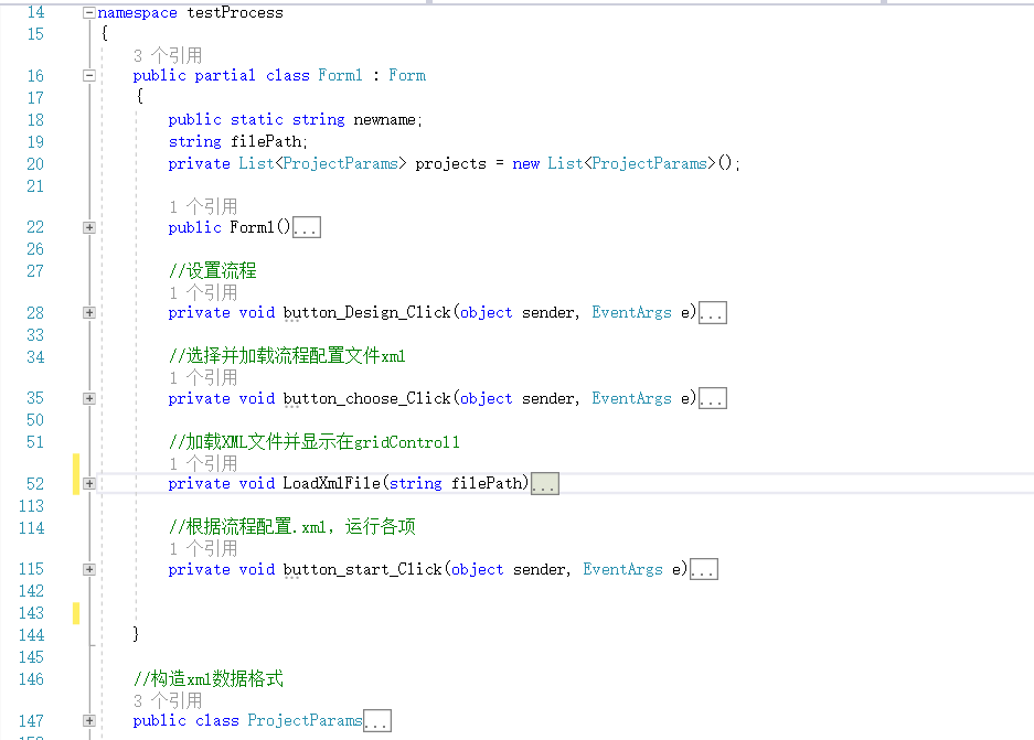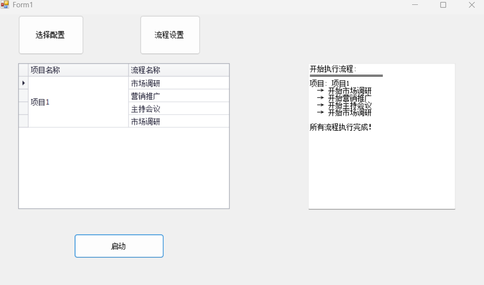 {public partial class Form1 : Form{public static string newname;string filePath;private List<ProjectParams> projects = new List<ProjectParams>();public Form1(){InitializeComponent();}//设置流程private void button_Design_Click(object sender, EventArgs e){designprocess designprocess1 = new designprocess();designprocess1.ShowDialog();}//选择并加载流程配置文件xmlprivate void button_choose_Click(object sender, EventArgs e){//选择xml文件using (OpenFileDialog openFileDialog = new OpenFileDialog()){openFileDialog.Filter = "XML文件|*.xml|所有文件|*.*";openFileDialog.Title = "选择流程配置文件";if (openFileDialog.ShowDialog() == DialogResult.OK){filePath = openFileDialog.FileName;LoadXmlFile(filePath);}}}//加载XML文件并显示在gridControl1private void LoadXmlFile(string filePath){try{projects.Clear(); // 清空现有项目列表XDocument doc = XDocument.Load(filePath);// 初始化DataTableDataTable dataTable = new DataTable();dataTable.Columns.Add("项目名称");dataTable.Columns.Add("流程名称");foreach (var projectElement in doc.Root.Elements("Project")){string projectName = projectElement.Attribute("name")?.Value;var project = new ProjectParams{Name = projectName,};foreach (var processElement in projectElement.Elements("process")){string processName = processElement.Attribute("name")?.Value;string displayText = processElement.Element("param")?.Attribute("value")?.Value;project.Processes.Add(new Process{Name = processName,DisplayText = displayText});// 添加到DataTabledataTable.Rows.Add(projectName, processName);}projects.Add(project);}gridControl1.DataSource = dataTable;// 强制生成列gridView1.PopulateColumns();// 现在再设置合并单元格gridView1.OptionsView.AllowCellMerge = true;gridView1.Columns["项目名称"].OptionsColumn.AllowMerge = DevExpress.Utils.DefaultBoolean.True;gridView1.Columns["流程名称"].OptionsColumn.AllowMerge = DevExpress.Utils.DefaultBoolean.False;gridView1.BestFitColumns();MessageBox.Show($"成功加载配置文件,共 {projects.Count} 个项目", "成功",MessageBoxButtons.OK, MessageBoxIcon.Information);}catch (Exception ex){MessageBox.Show($"加载XML文件失败: {ex.Message}", "错误",MessageBoxButtons.OK, MessageBoxIcon.Error);}}//根据流程配置.xml,运行各项private void button_start_Click(object sender, EventArgs e){if (projects.Count == 0){MessageBox.Show("请先选择流程配置文件", "提示", MessageBoxButtons.OK, MessageBoxIcon.Information);return;}textBox1.Clear();textBox1.AppendText("开始执行流程:" + "\r\n");textBox1.AppendText("====================" + "\r\n");foreach (var project in projects){textBox1.AppendText($"项目: {project.Name}" + "\r\n");foreach (var process in project.Processes){textBox1.AppendText($" → {process.DisplayText}" + "\r\n");// 这里可以添加实际的业务逻辑Thread.Sleep(1000);Application.DoEvents(); // 让UI能够更新}textBox1.AppendText("\r\n");}textBox1.AppendText("所有流程执行完成!" + "\r\n");}}//构造xml数据格式public class ProjectParams{public string Name { get; set; }public List<Process> Processes { get; set; } = new List<Process>();}public class Process{public string Name { get; set; }public string DisplayText { get; set; }}public static class GlobalVariables{public static string newname { get; set; } = "项目1";}