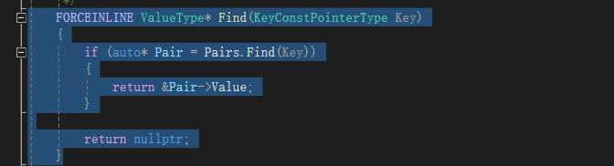 {TMap<int32, FString> FruitMap;FruitMap.Add(5, TEXT("Grapefruit"));FruitMap.Add(7, TEXT("Pineapple"));FruitMap.Add(9, TEXT("Pear")); //添加相同的键,会重置掉原来的FString* Ptr7 = FruitMap.Find(7);FString* Ptr8 = FruitMap.Find(8);if (FString* Ptr7Test = FruitMap.Find(7)){UE_LOG(LogTemp,Warning,TEXT("%d-%s"),7,**Ptr7Test);}}FindOrAdd如果没有查询到,就会创建新的元素加入,返回的是引用。