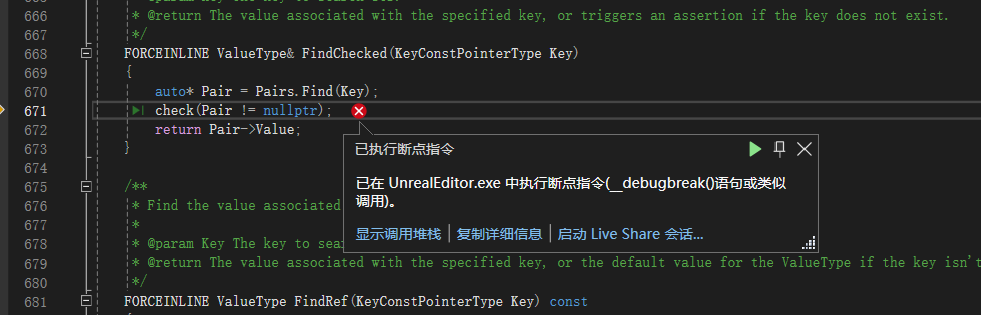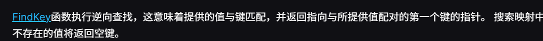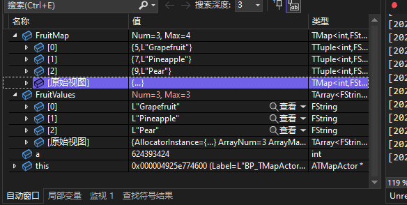 {TMap<int32, FString> FruitMap;FruitMap.Add(5, TEXT("Grapefruit"));FruitMap.Add(7, TEXT("Pineapple"));FruitMap.Add(9, TEXT("Pear"));//按照值去找key,更慢。且只找第一个const int32* KeyPearPtr = FruitMap.FindKey(TEXT("Pear"));const int32* KeyPineapplePtr = FruitMap.FindKey(TEXT("Pineapple"));