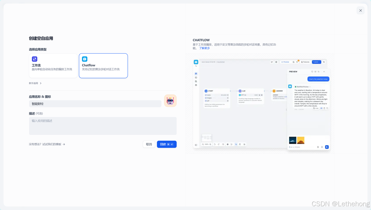 在应用类型中选择"Chatflow",输入具有辨识度的应用名称。