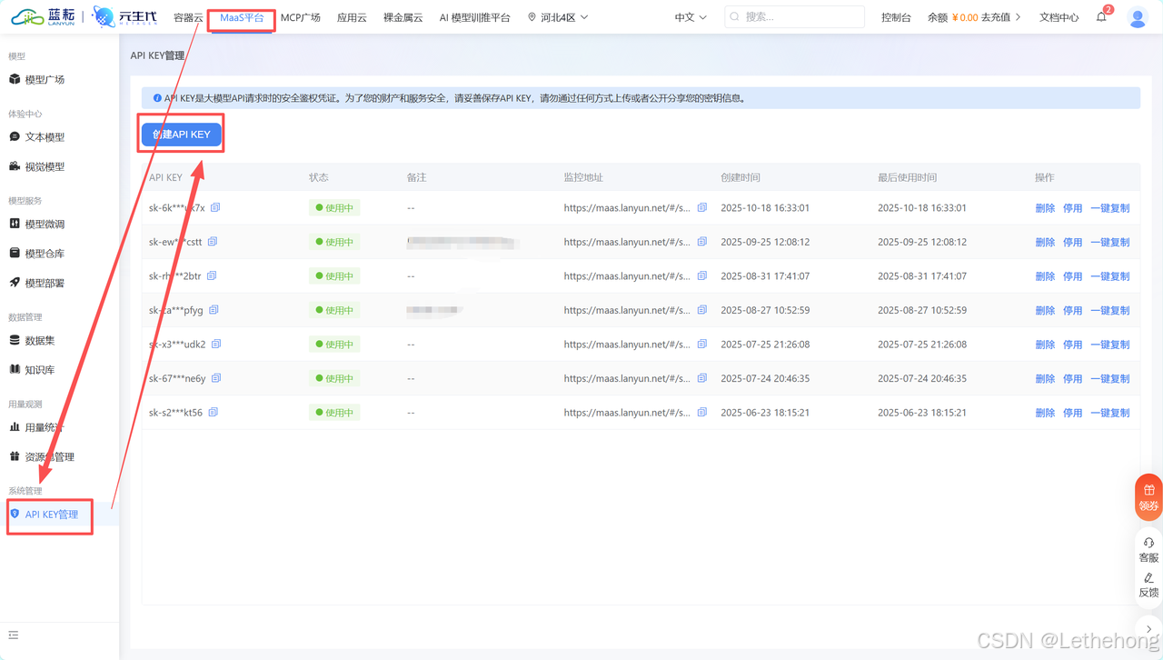 点击蓝耘访问蓝耘MaaS平台官网完成注册。登录后,在控制台的"API KEY管理"页面,你可以创建专属的API密钥,这是调用所有服务的前提