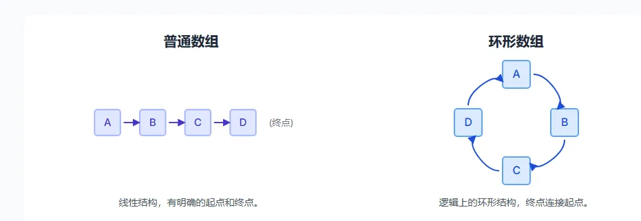 想象一下,一个普通的数组就像一条单行道,走到尽头就是终点。而环形数组则像一个环形的跑道,跑到终点后,下一步自然就回到了起点。