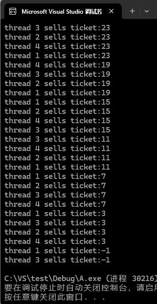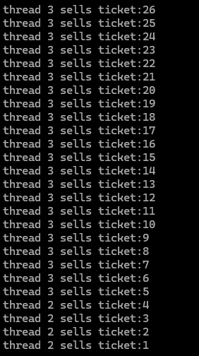 {char* id = (char*)arg;while (1) {if (ticket > 0) {usleep(1000);printf("%s sells ticket:%d\n", id, ticket);ticket--;}else {break;}}