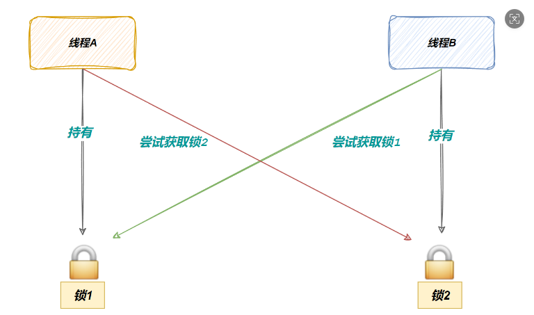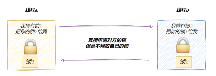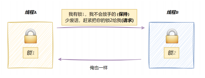 死锁是指在⼀组进程中的各个进程均占有不会释放的资源,但因互相申请被其他进程所站⽤不会释放的资源⽽处于的⼀种永久等待状态。为了⽅便表述,假设现在线程A,线程B必须同时持有锁1和锁2,才能进⾏后续资源的访问