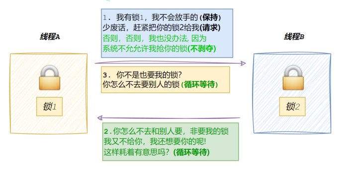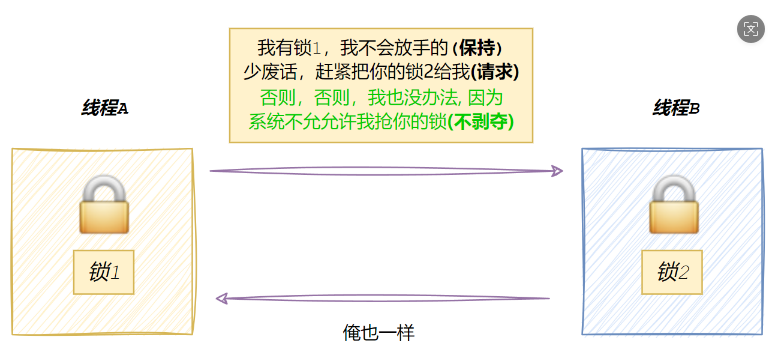 互斥条件:⼀个资源每次只能被⼀个执⾏流使⽤请求与保持条件:⼀个执⾏流因请求资源⽽阻塞时,对已获得的资源保持不放