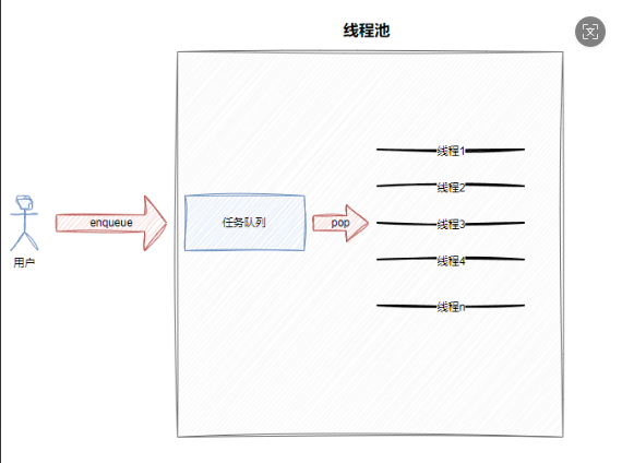 private:// 是要有的,必须是私有的ThreadPool(int threadnum = gdefaultthreadnum) : _threadnum(threadnum),_waitnum(0), _isrunning(false){LOG(LogLevel::INFO) << "ThreadPool Construct()";}void InitThreadPool(){// 指向构建出所有的线程,并不启动for (int num = 0; num < _threadnum; num++){_threads.emplace_back(std::bind(&ThreadPool::HandlerTask, this));LOG(LogLevel::INFO) << "init thread " << _threads.back().Name() << " done";}}void Start(){_isrunning = true;for (auto &thread : _threads){thread.Start();LOG(LogLevel::INFO) << "start thread " << thread.Name() << "done";}}void HandlerTask() // 类的成员⽅法,也可以成为另⼀个类的回调⽅法,⽅便我们继续类级别的互相调⽤!{std::string name = GetThreadNameFromNptl();LOG(LogLevel::INFO) << name << " is running...";while (true){// 1. 保证队列安全_mutex.Lock();// 2. 队列中不⼀定有数据while (_task_queue.empty() && _isrunning){_waitnum++;_cond.Wait(_mutex);_waitnum--;}// 2.1 如果线程池已经退出了 && 任务队列是空的if (_task_queue.empty() && !_isrunning){_mutex.Unlock();break;}// 2.2 如果线程池不退出 && 任务队列不是空的// 2.3 如果线程池已经退出 && 任务队列不是空的 --- 处理完所有的任务,然后在退出// 3. ⼀定有任务, 处理任务T t = _task_queue.front();_task_queue.pop();_mutex.Unlock();LOG(LogLevel::DEBUG) << name << " get a task";// 4. 处理任务,这个任务属于线程独占的任务t();}}// 复制拷⻉禁⽤ThreadPool<T> &operator=(const ThreadPool<T> &) = delete;ThreadPool(const ThreadPool<T> &) = delete;public:static ThreadPool<T> *GetInstance(){// 如果是多线程获取线程池对象下⾯的代码就有问题了!!// 只有第⼀次会创建对象,后续都是获取// 双判断的⽅式,可以有效减少获取单例的加锁成本,⽽且保证线程安全if (nullptr == _instance) // 保证第⼆次之后,所有线程,不⽤在加锁,直接返回_instance单例对象{LockGuard lockguard(_lock);if (nullptr == _instance){_instance = new ThreadPool<T>();_instance->InitThreadPool();_instance->Start();LOG(LogLevel::DEBUG) << "创建线程池单例";return _instance;}}LOG(LogLevel::DEBUG) << "获取线程池单例";return _instance;}void Stop(){_mutex.Lock();_isrunning = false;_cond.NotifyAll();_mutex.Unlock();LOG(LogLevel::DEBUG) << "线程池退出中...";}void Wait(){for (auto &thread : _threads){thread.Join();LOG(LogLevel::INFO) << thread.Name() << " 退出...";}}bool Enqueue(const T &t){bool ret = false;_mutex.Lock();if (_isrunning){_task_queue.push(t);if (_waitnum > 0){_cond.Notify();}LOG(LogLevel::DEBUG) << "任务⼊队列成功";ret = true;}_mutex.Unlock();return ret;}~ThreadPool(){}private:int _threadnum;std::vector<Thread> _threads; // for fix, int tempstd::queue<T> _task_queue;Mutex _mutex;Cond _cond;int _waitnum;bool _isrunning;// 添加单例模式static ThreadPool<T> *_instance;static Mutex _lock;