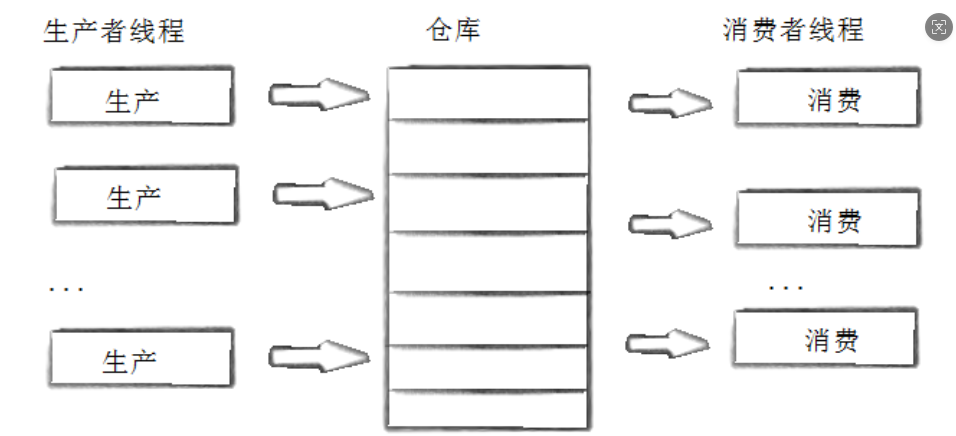这里的仓库就是一个阻塞队列,这样一来,只要阻塞队列里有空间,就可以进行生产,只要阻塞队列里还有数据,就可以进行消费,两类线程间的关联就变弱了,也就可以并发进行,从而使效率变高。
