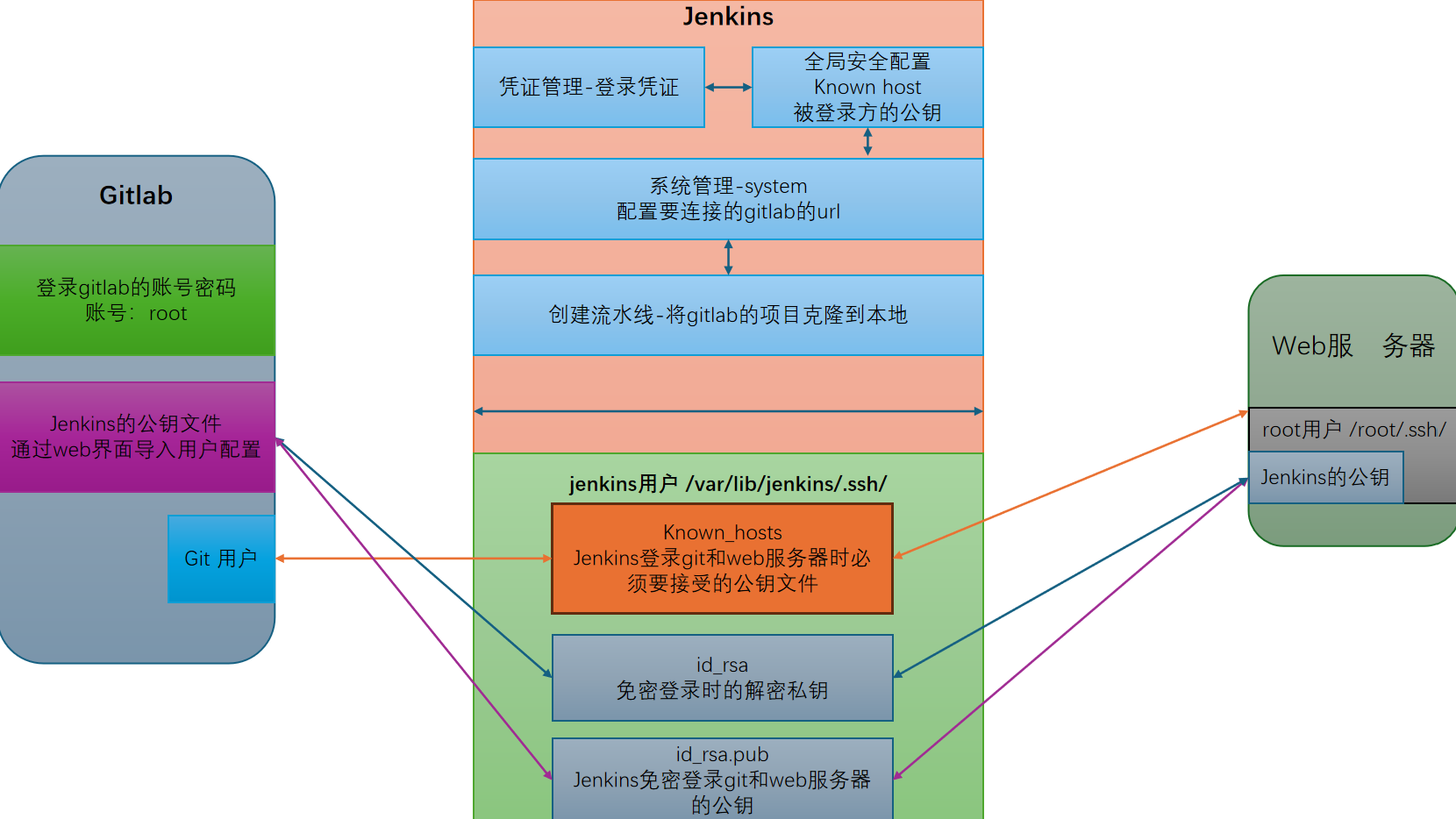 注:在jenkins服务器上使用root身份创建密钥对,使用jenkins机器的root用户分别连接gitlab的git用户和web服务器的root用户,获取对方的公钥文件(不需要连接成功只需要接受公钥即可)