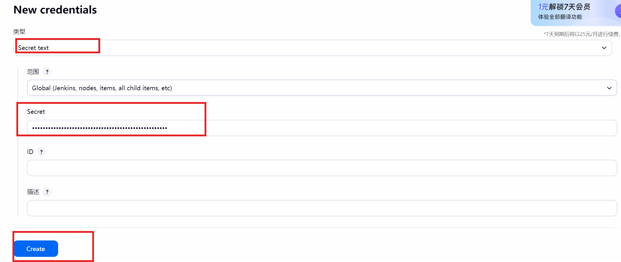 - 将生成的访问令牌复制到jenkins的凭据中,类型选择“Secret text”