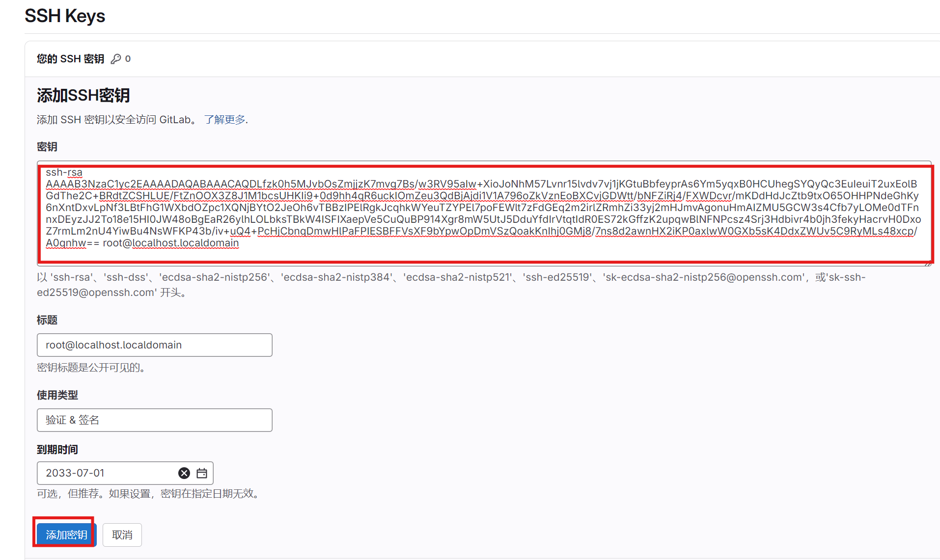 - 将jenkins的公钥添加到gitlab的授权密钥中