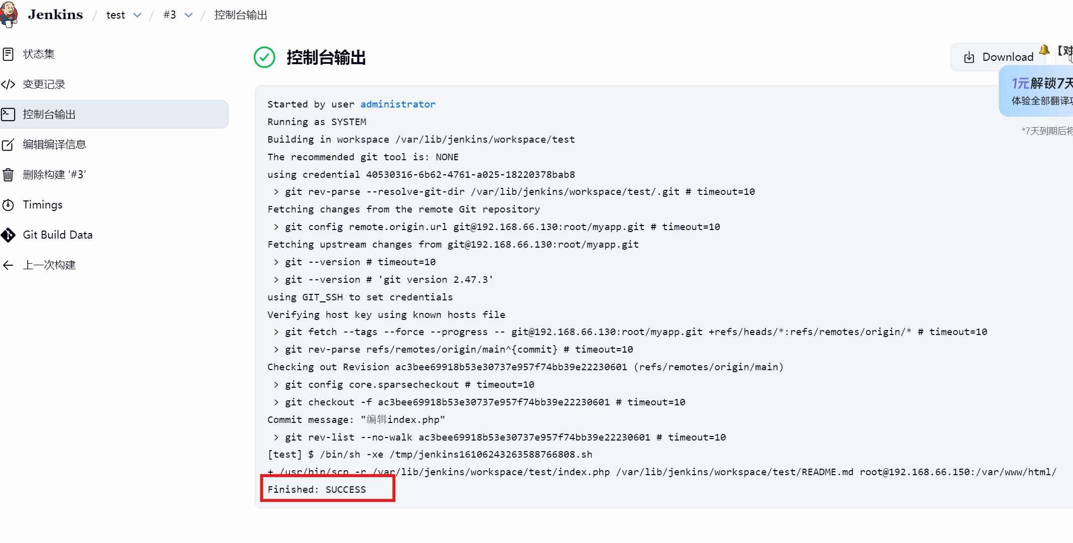 注:可以看到Jenkins服务器已经成功拉取到了GitLab服务器的项目