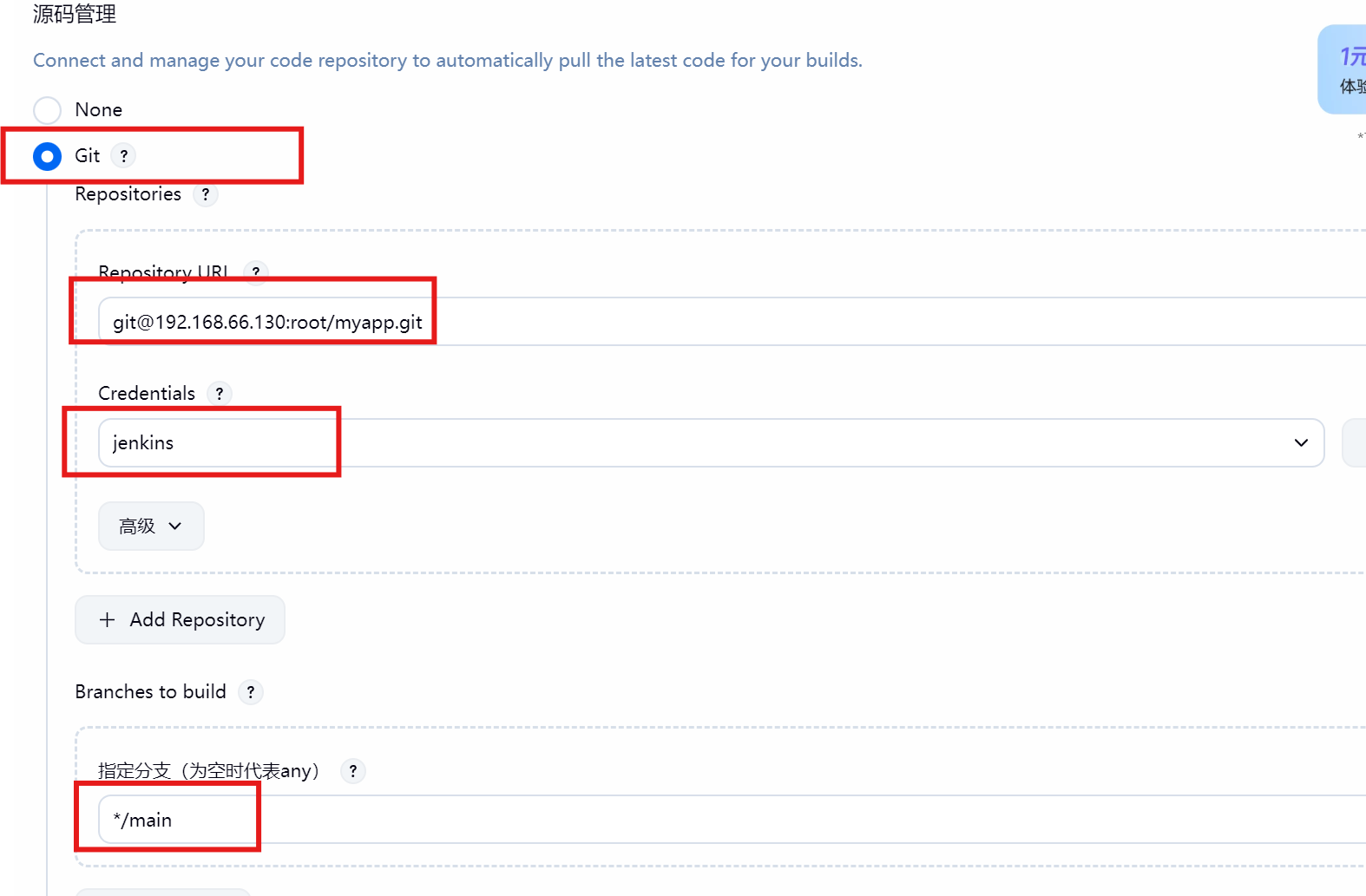 - 在“源码管理”中选择“Git”,输入gitlab的仓库地址,例如: git@192.168.66.130:root/myapp.git