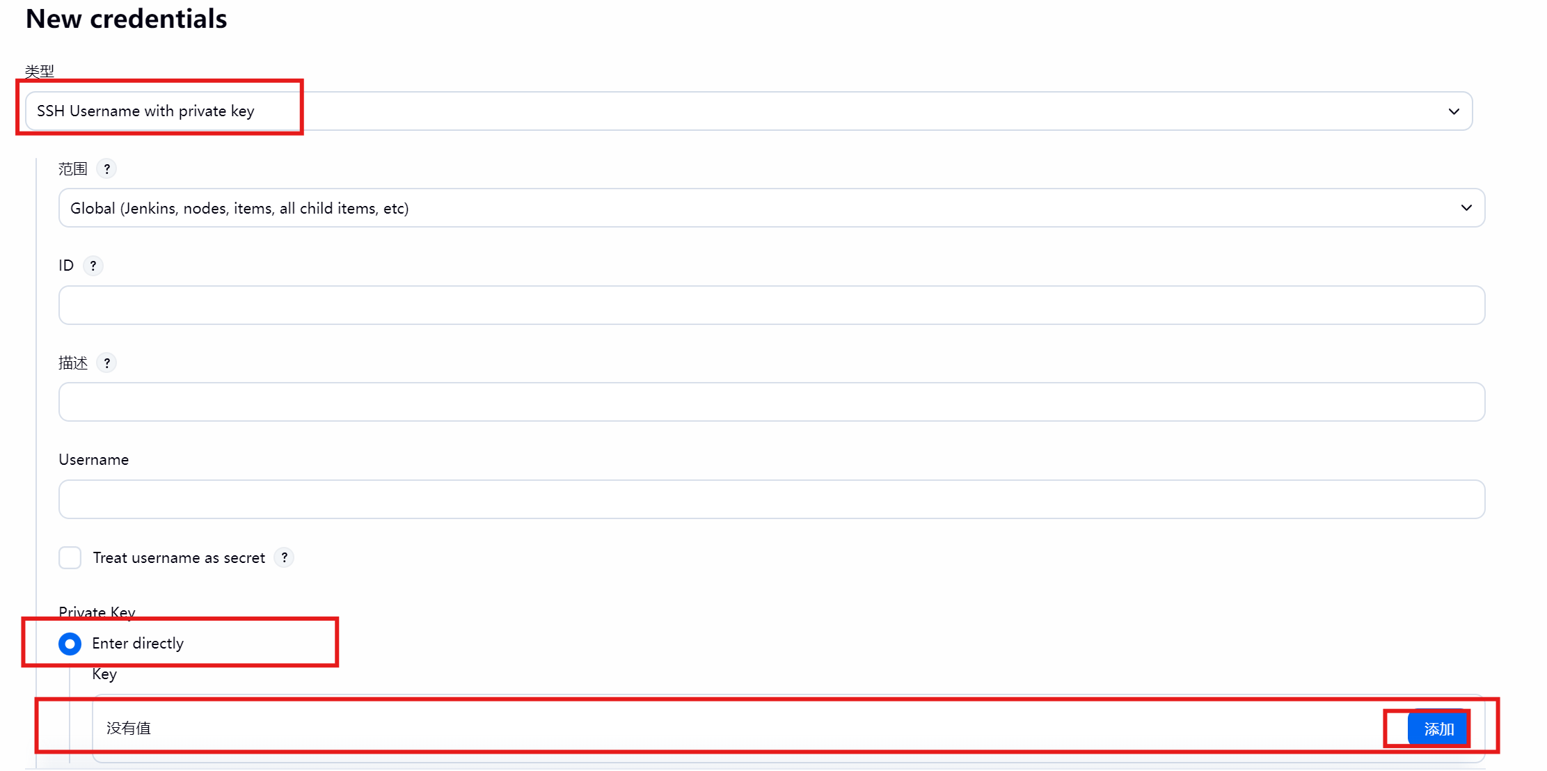 注:在jenkins上,进入“凭据管理” -> “系统(system)” -> “全局凭据” -> “添加凭据”;选择“SSH Username with private key”,选择"Private Key",然后输入私钥(id_rsa)内容,(用户名空着就行)