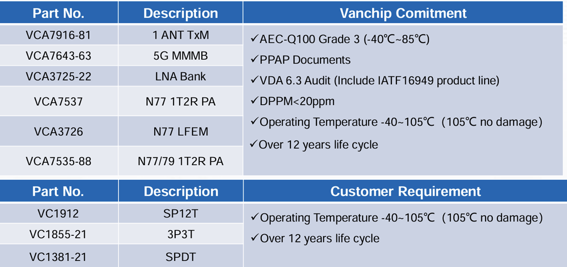所有 VCA 芯片均通过严格的第三方 AEC-Q100 认证测试,并在通过 IATF16949 认证的生产线上进行封测。VANCHIP 承诺提供宽温域(-40℃~85℃)、超长生命周期(≥12年)以及 PPAP 文件支持,以满足车规级的严苛要求。VANCHIP 正在准备推出更宽温域(-40℃~105℃)的产品。具体来说,车规级射频功放具有以下特点: