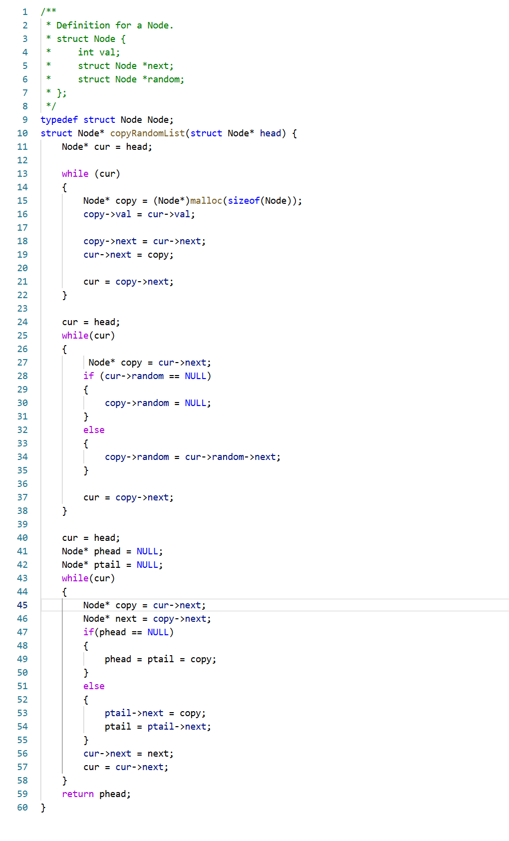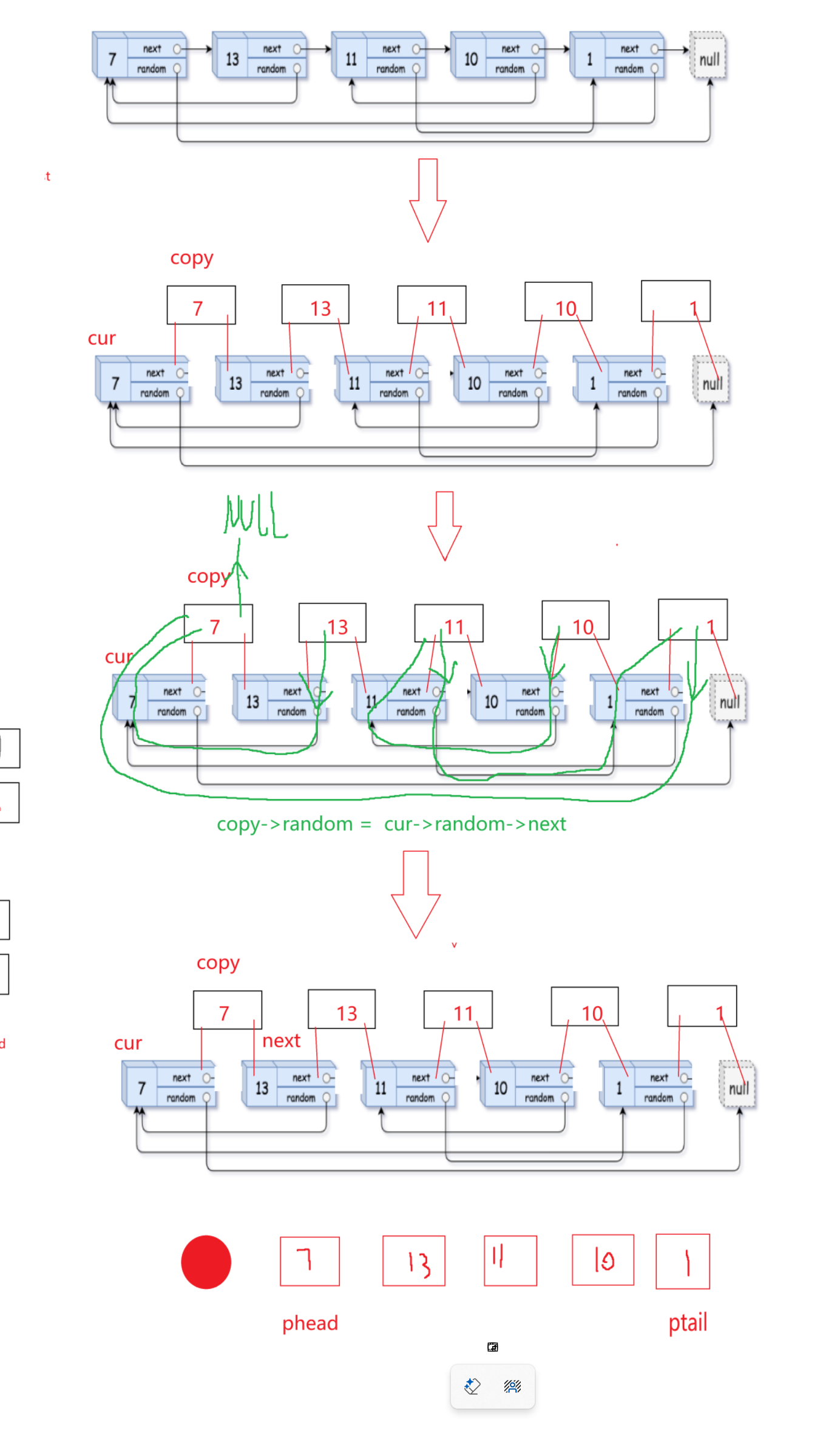 我们再拿到这题的时候应该会感觉不太好处理,因为不仅是拷贝链表相当与它们之间的关系我们都要拷贝,所以这题会运用一个非常巧妙的方法。就是把拷贝的节点先插入到原链表中,这样我们可以发现random可以顺着连接,最后把拷贝的节点整合在一起。