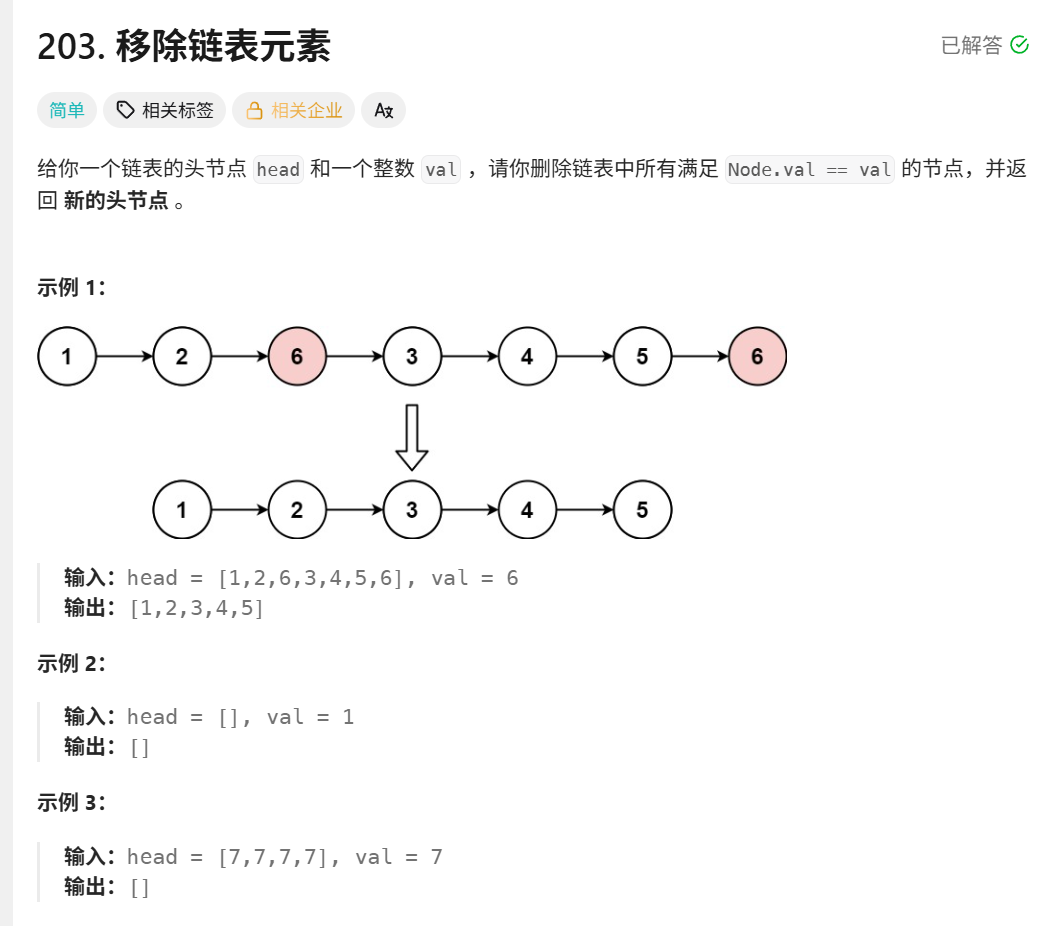这是题目内容,如果想自己尝试,链接:https://leetcode.cn/problems/remove-linked-list-elements