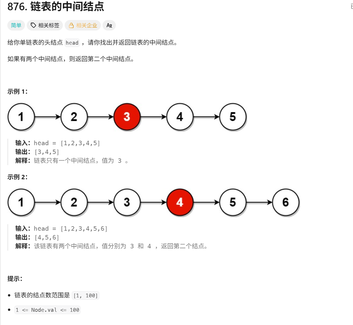 这是题目内容,如果想自己尝试,链接:https://leetcode.cn/problems/middle-of-the-linked-list