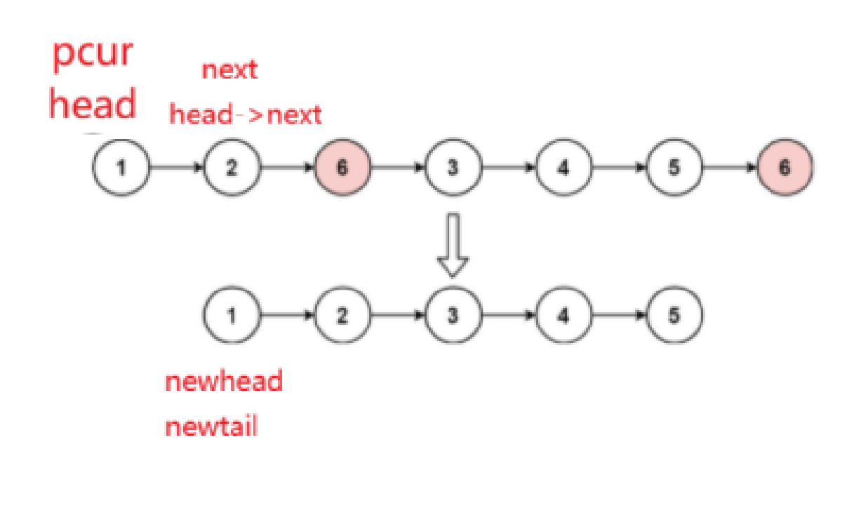 我们拿到这题的思路是创建一个新链表,遍历旧链表不等于val的节点拿到新链表中(注意链表为空的特殊情况),等于val的节点直接释放,最后要注意把尾节点的next置为NULL
