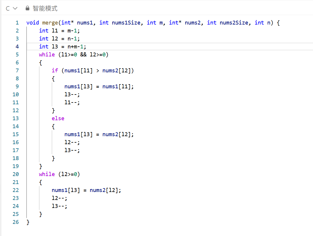 我们在拿到这一题的时候会发现这是两个非递减数组的合并,我们有两种思路。第一是把数组2直接插到数组1的后面然后进行排序。第二是利用数组1的空间和两个数组都是递增的情况,从数组有效数字的地方逐个进行比较然后从数组1的最后开始插入。