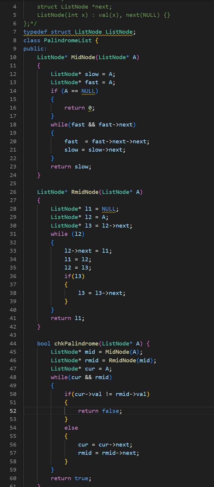 这种类似的问题我们在数组中遇到过类似的,如果是数组的回文结构就简单很多,用两个指针一个从前往后另外一个从后往前,逐个对比。但单链表是没有办法从后节点找到前节点的,这里我们有一个比较巧妙的思路,就是用到之前的反转链表。