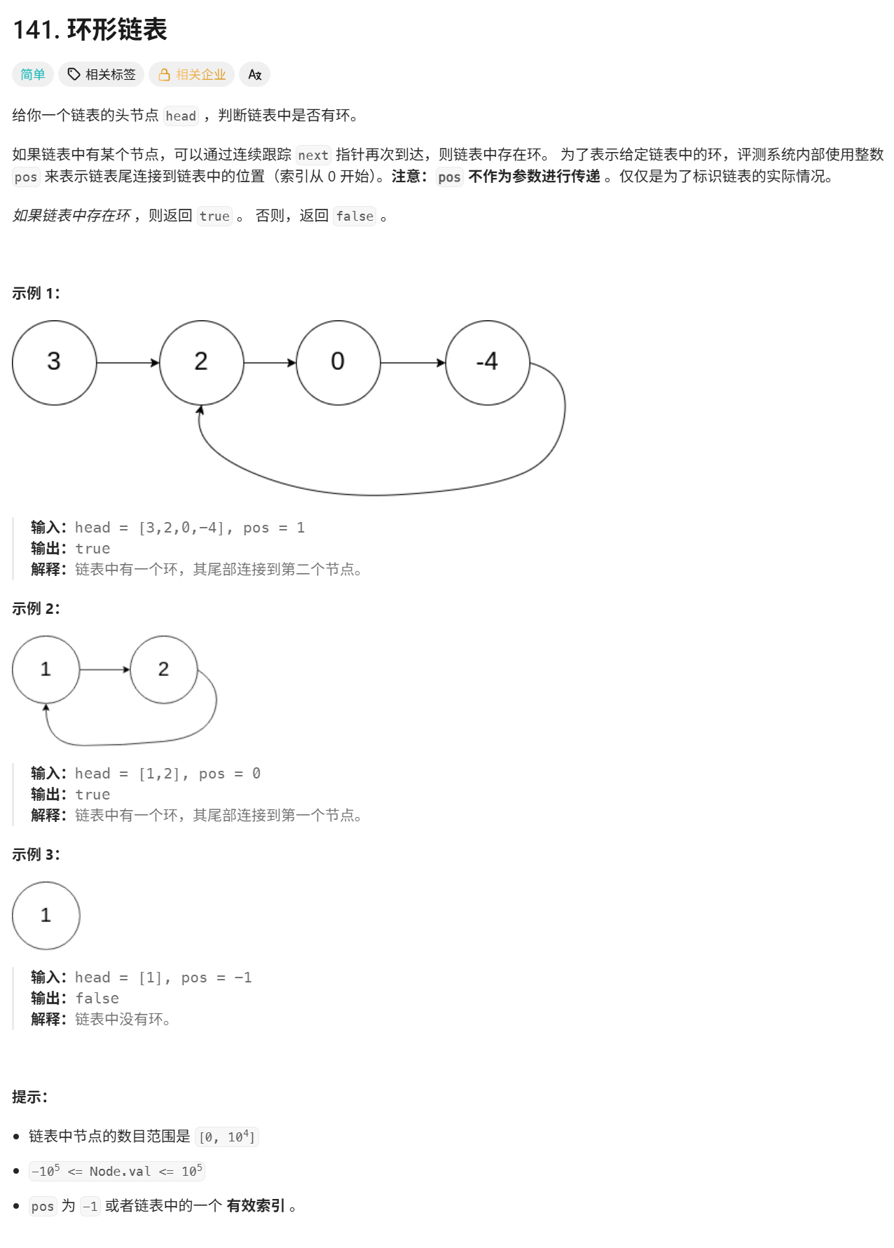 这是题目内容,如果想自己尝试,链接:https://leetcode.cn/problems/linked-list-cycle
