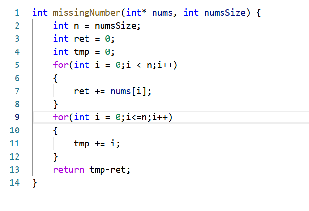 这个题目与其说是一个算法题其实更加像是一个数学题,直接计算0到N的所有数加在一起然后减去数组中所有数加在一起不就是消失的那个数了。