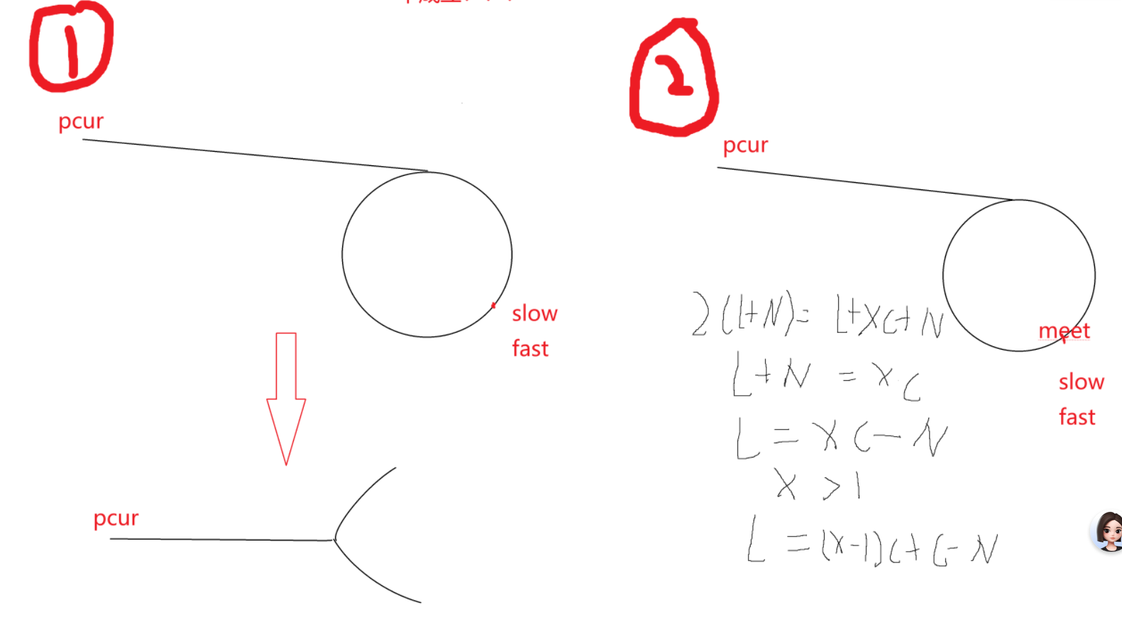 这题是上一题的一个进阶,判断是否环形我们就不多说了。想要找到那个节点我们有两种思路,一十找到快慢指针的相遇节点然后把它断开,这样就给问题转变成相交链表了,这个我们就不在多说了。二是与上一题拓展同样的与数学相联系。