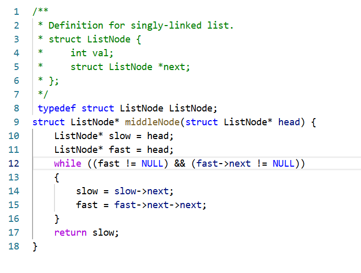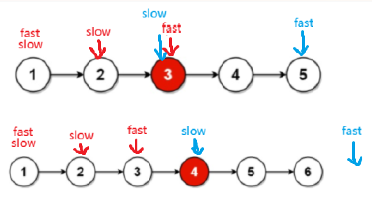 这个题目不太难但是涉及到一个快慢指针的思想,我们创建两个新指针都指向头节点,但是慢指针一次走一步,慢指针一次走两步,我们可以看到下面两种情况:奇数个数时快指针走到尾节点,慢指针到中间节点。偶数个数时快指针走到NULL,慢指针走到中间节点。