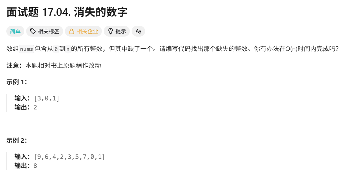 这是题目内容,如果想自己尝试,链接:https://leetcode.cn/problems/missing-number-lcci