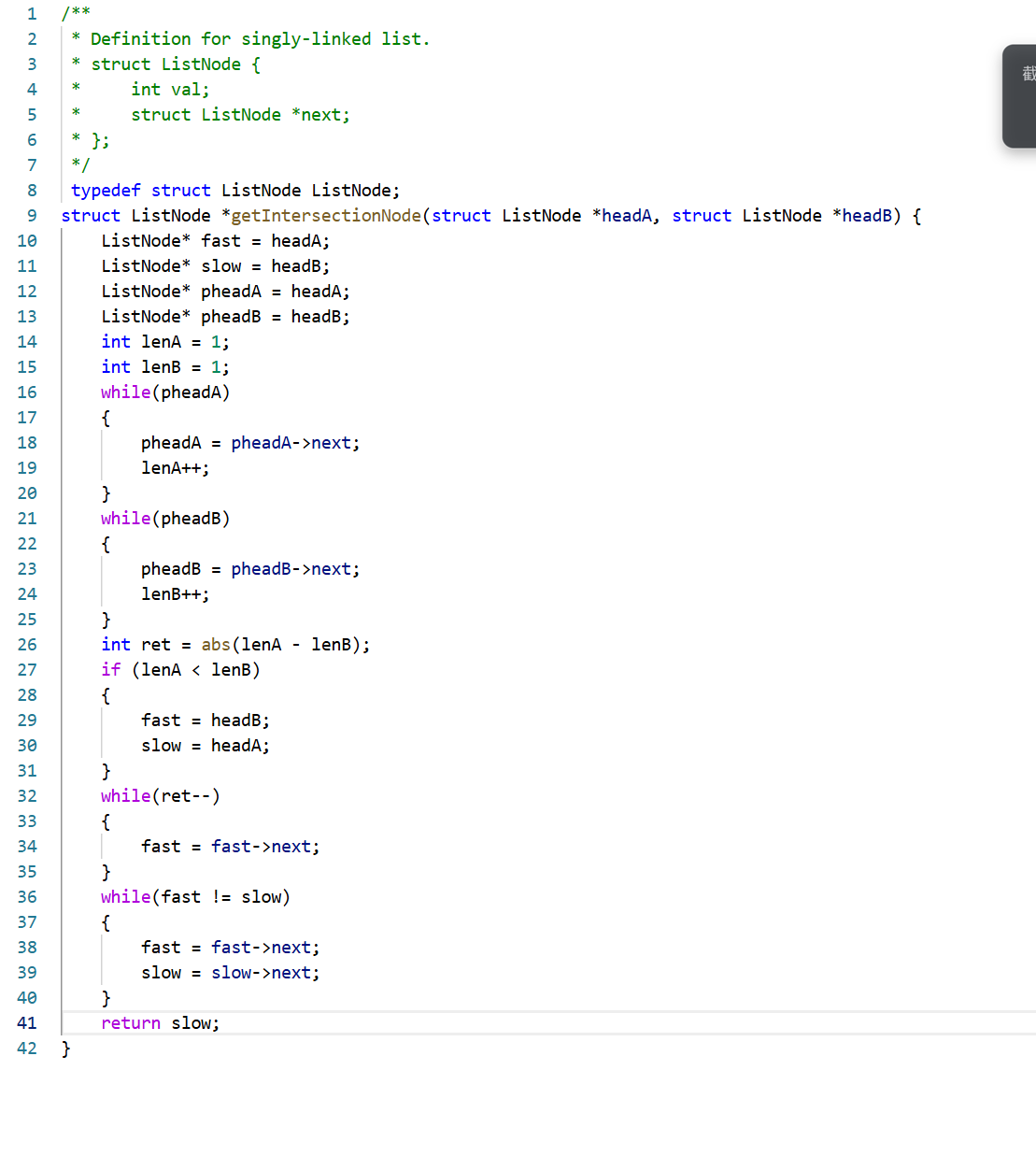 拿到这题我们通过观察可知,链表相交则它们的尾节点是同一个,想找到相交节点我们还是利用快慢指针的方法,得到两个指针的节点个数,让快指针先走长度差步,再一起往前移动并判断节点是否相同。注意我们在判断那条链表用快指针时用了一个假设法,先假设A链表长用快指针,如果不是再和B交换。