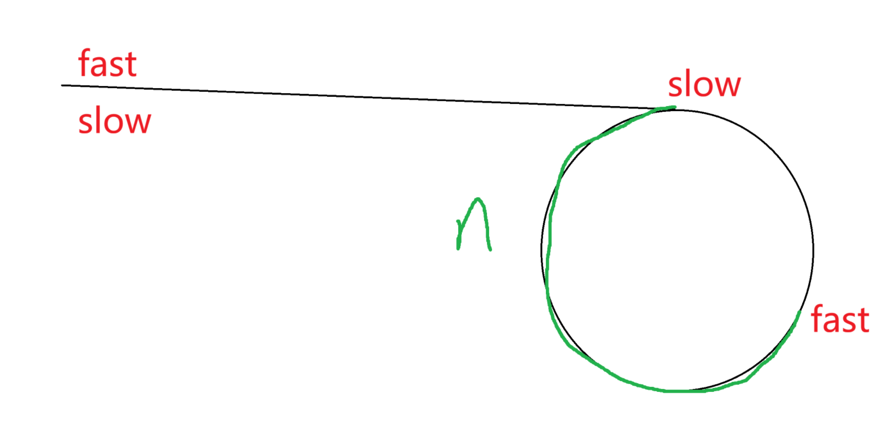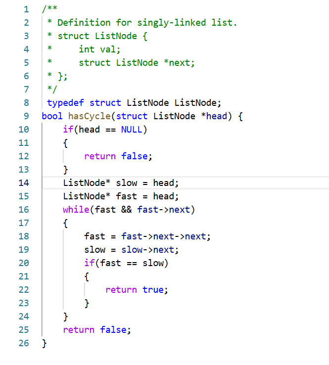 这题我们可以使用快慢指针(慢指针一次走1步,快指针一次走2步)解决,当慢指针言进入循环时,快指针和它的距离的N,它们的距离会越来越小(N,N-1,N-2......1,0)只要快慢指针相遇就说明链表是环形。